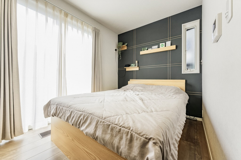 シックなアクセントクロスが施された約6帖の洋室。ウォークインクローゼットを備えています。