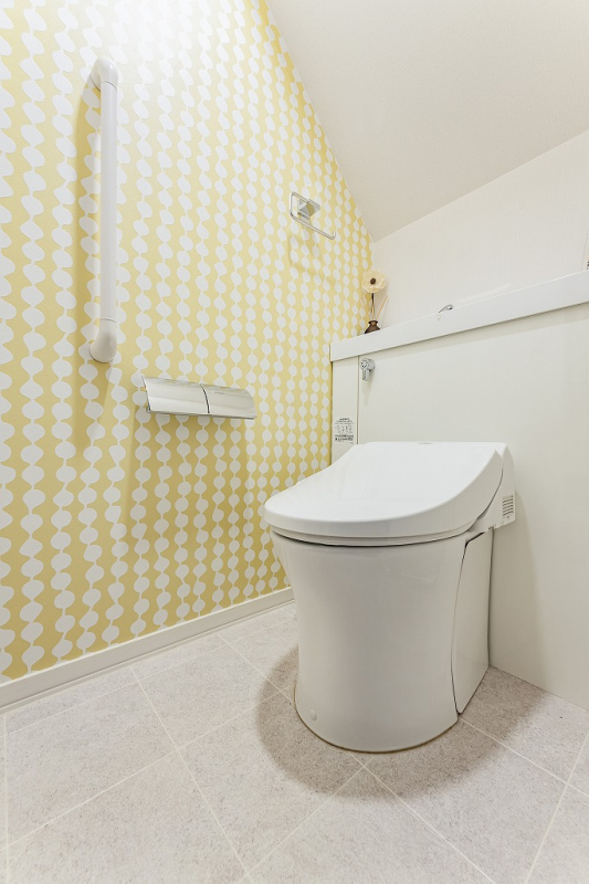 タンクが隠れるカウンター付きですっきりとしたトイレ。爽やかなアクセントクロスが清潔感のある印象に。