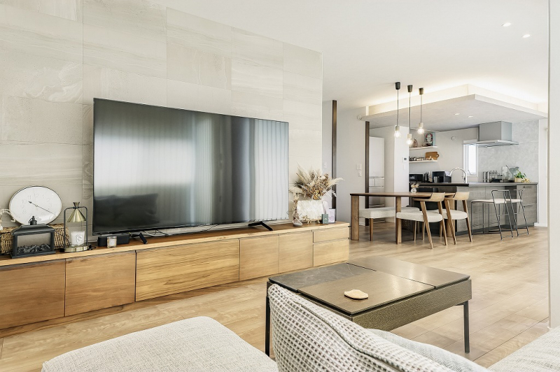 自然と家族の会話が生まれるような明るいリビング。正面にはエコカラットを施し、上品さをプラスしています