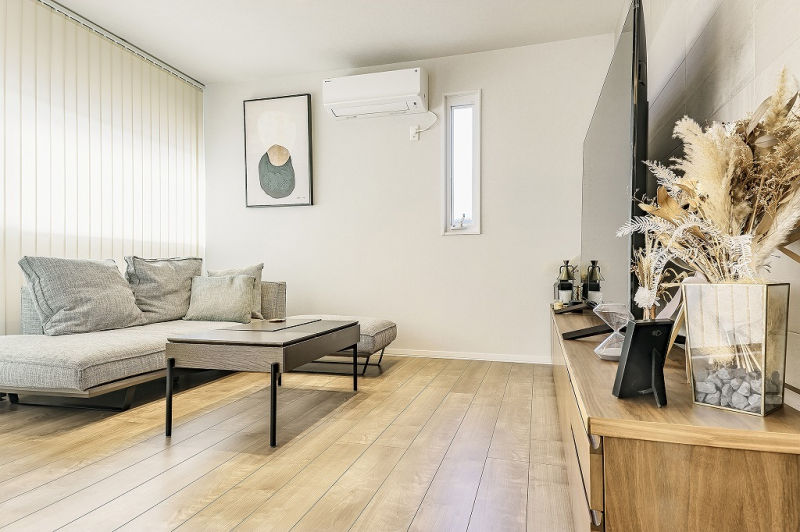 南側の窓から陽光が注ぐ明るいリビング。ご家族でゆったりと過ごせる憩いの空間です。