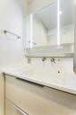 カウンターと一体型のボウルですっきりとしたデザイン。上から吐水するタイプでお手入れのしやすい洗面台。