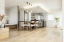 キッチンにはビンテージ風味のある木目柄を使用し、モダンで味わいのある空間に仕上がっています。