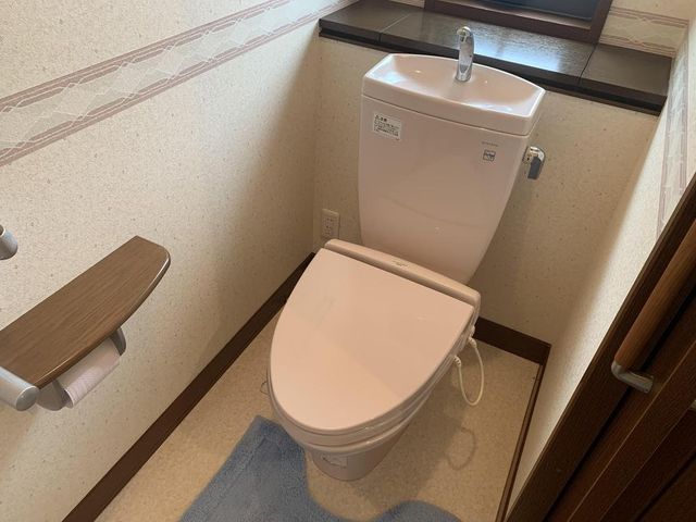 【1階トイレ】手洗い器付きです。タオルハンガーと、手すり付きのトイレットペーパーホルダーが設置されています。