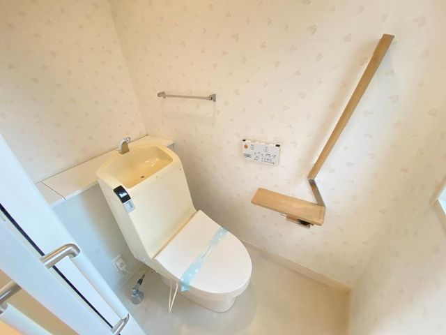 【トイレ】温水洗浄便座+手洗い器付き。背面に棚があり、トイレットペーパーなどを置いていただけます。