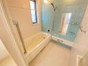 【浴室】壁面に、アクセントパネルが施されています。シャワーヘッドはスライドバーで高さ調整が可能です。