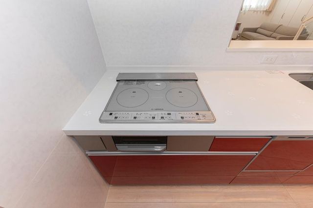3口コンロ仕様で、料理の同時進行が可能。操作ボタンはスイッチタイプです。/2025年5月撮影