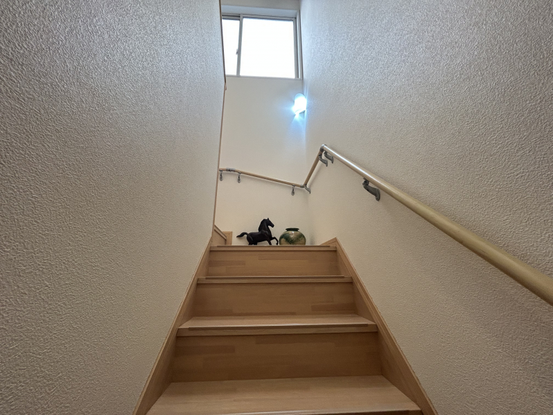 窓から陽光が差し込み、暗さを感じさせにくい階段です。手摺付きで昇り降りの負担を軽減してくれます。