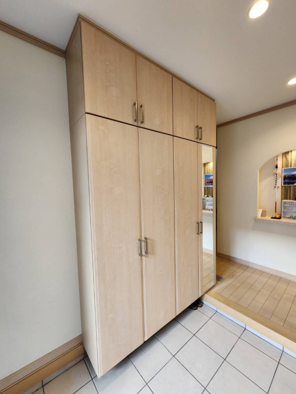 玄関横には収納棚が備わっています。ご家族の靴などしまえるので、玄関周りを綺麗に保てそうです。