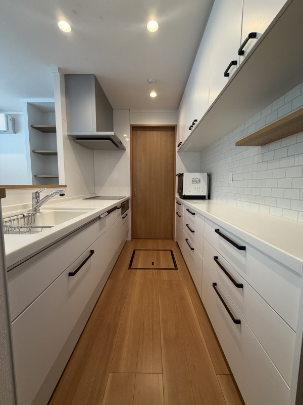 お洒落なキッチンにはパントリーやカップボードなどの機能性がある収納があり、使い勝手も◎。