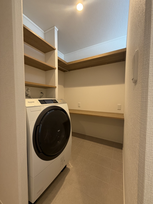 まるでホテルのようなランドリースペース。タオルや買い置きの洗剤を収納するスペースもございます。
