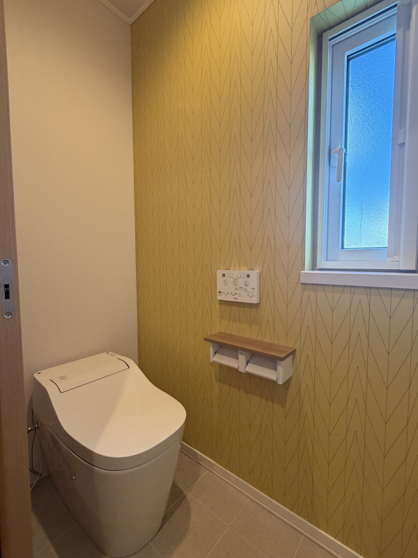 イエロー系のアクセントクロスが印象的なお洒落なトイレです。