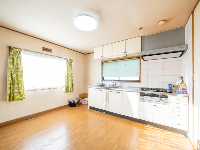キッチンは上部に吊戸棚、下部にも収納を備え、調理器具や食器の出し入れや整理がしっかり行えます。