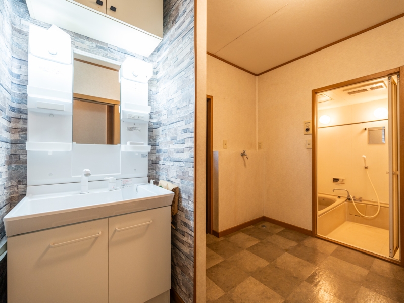 1階の洗面所は、洗面台が洗濯機置き場などから区切られ作業スペースを確保。