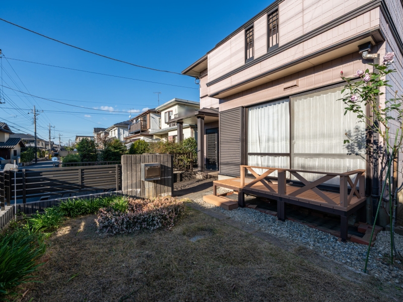 南西向きの庭にウッドデッキを設置。日当たり良好で遊びや菜園など多目的に活用できます。