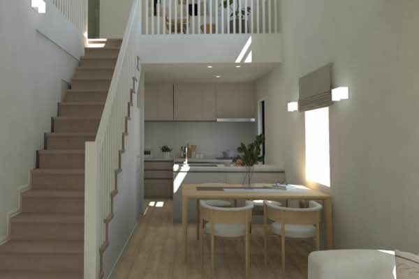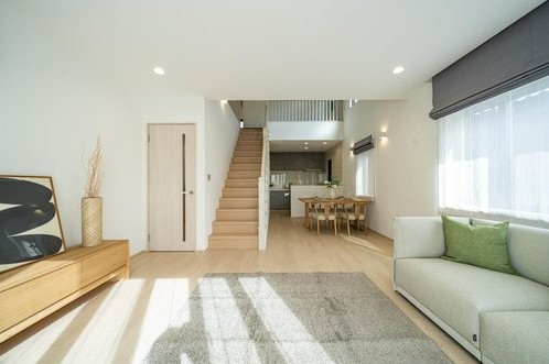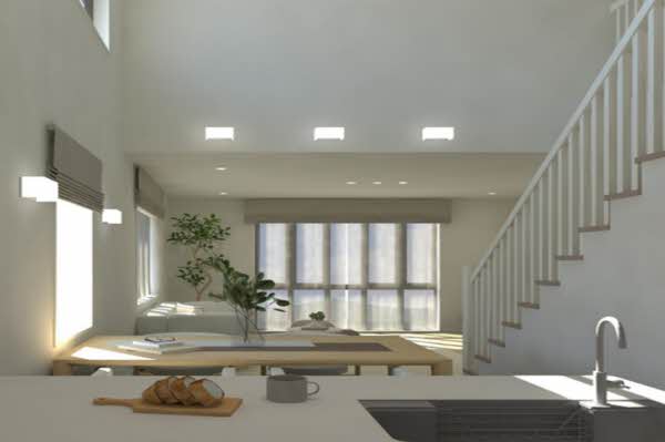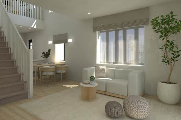 ■吹抜けと大きな窓で光が差し込むLDK