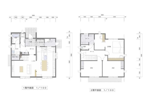 1F:和室撤去LDK拡張、シューズクローク・パントリー新設